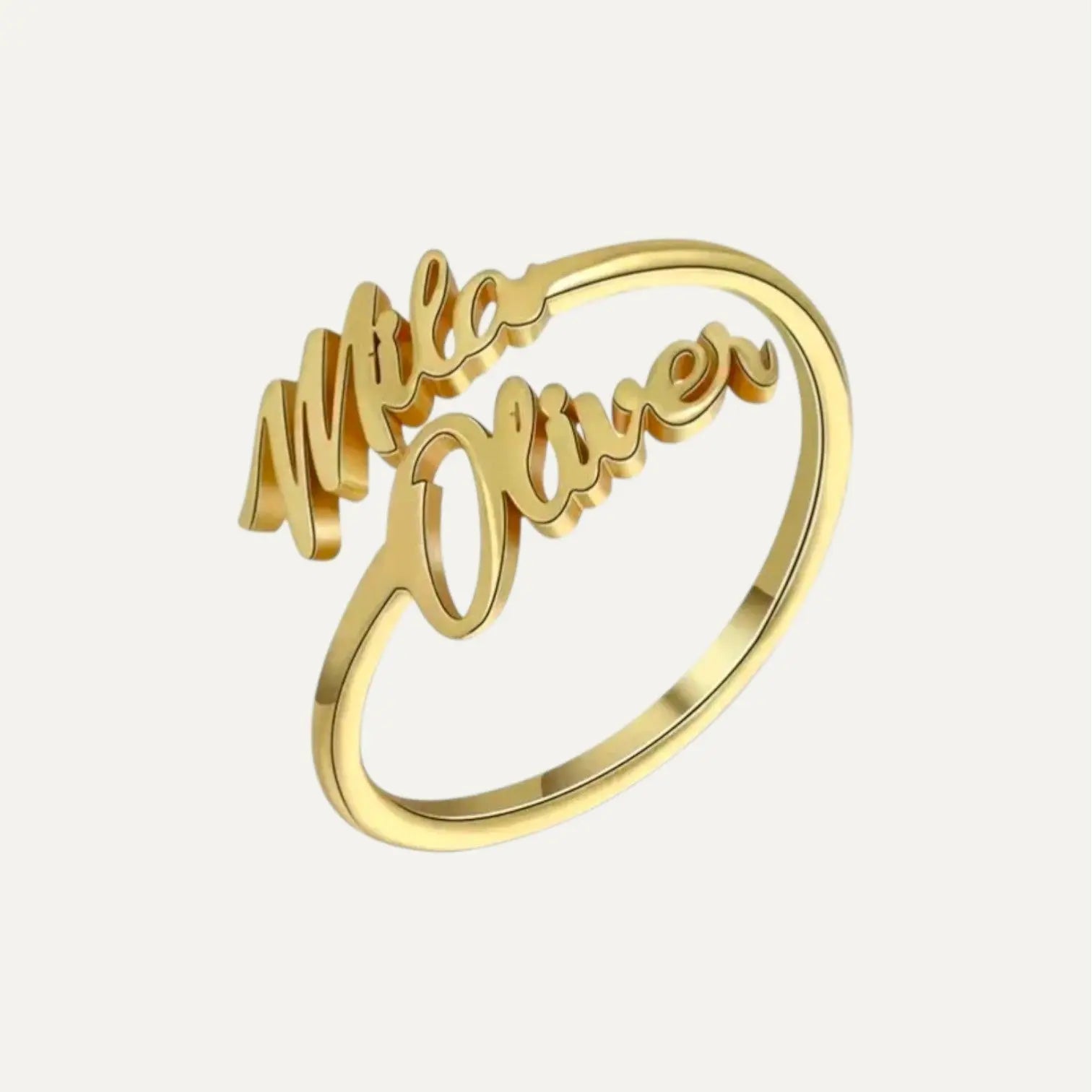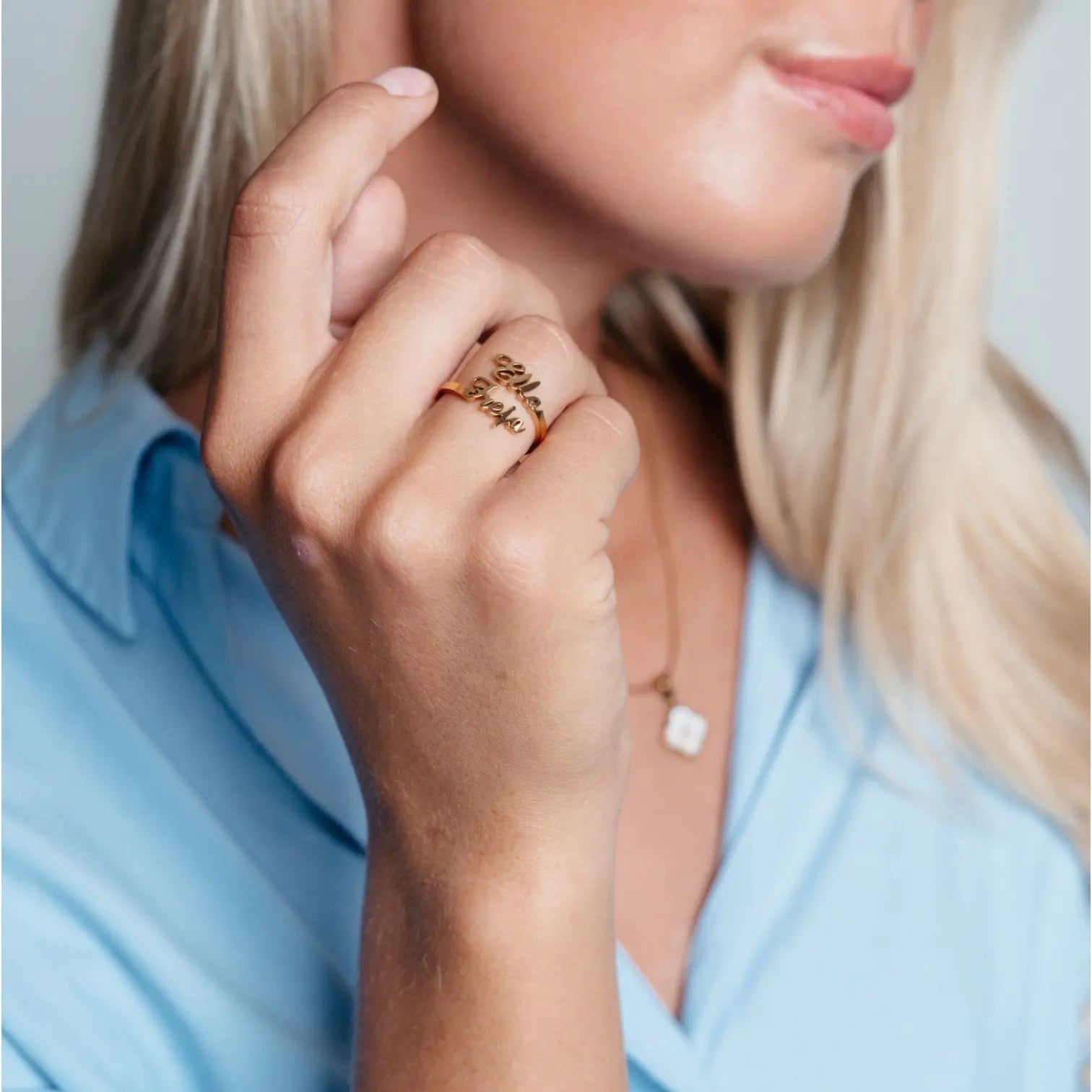 Vores Dobbelt Navnering er den perfekte måde at bære to betydningsfulde navne tæt på. Med sit unikke design, der fremhæver begge navne, kan denne ring symbolisere særlige relationer eller mindeværdige øjeblikke. Perfekt som gave til en, du holder af, eller som et personligt smykke, der repræsenterer dine vigtigste bånd. Et stilfuldt og personligt statement, som er både tidløst og moderne.